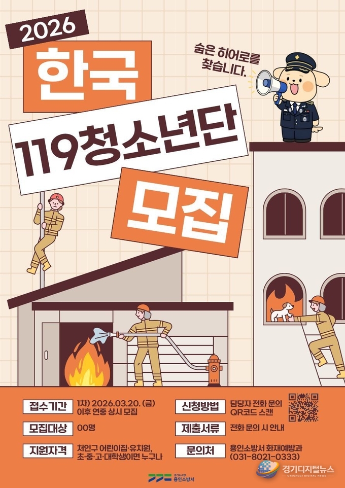 용인소방서(서장 길영관)는 미래 안전문화를 이끌어갈 2026년 한국119청소년단 신규 단원 모집을 실시한다고 밝혔다.