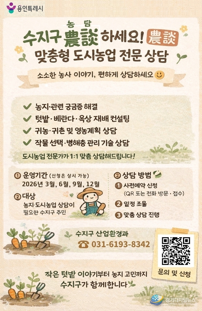 ‘수지구 농담(農談)하세요’는 도시화가 진행된 수지구에서 소규모 농지와 텃밭 활용에 대한 시민 관심이 높아짐에 따라 농지 행정과 재배 기술 등 도시농업 전반에 대한 정보를 제공하기 위해 마련한 상담 프로그램이다.
