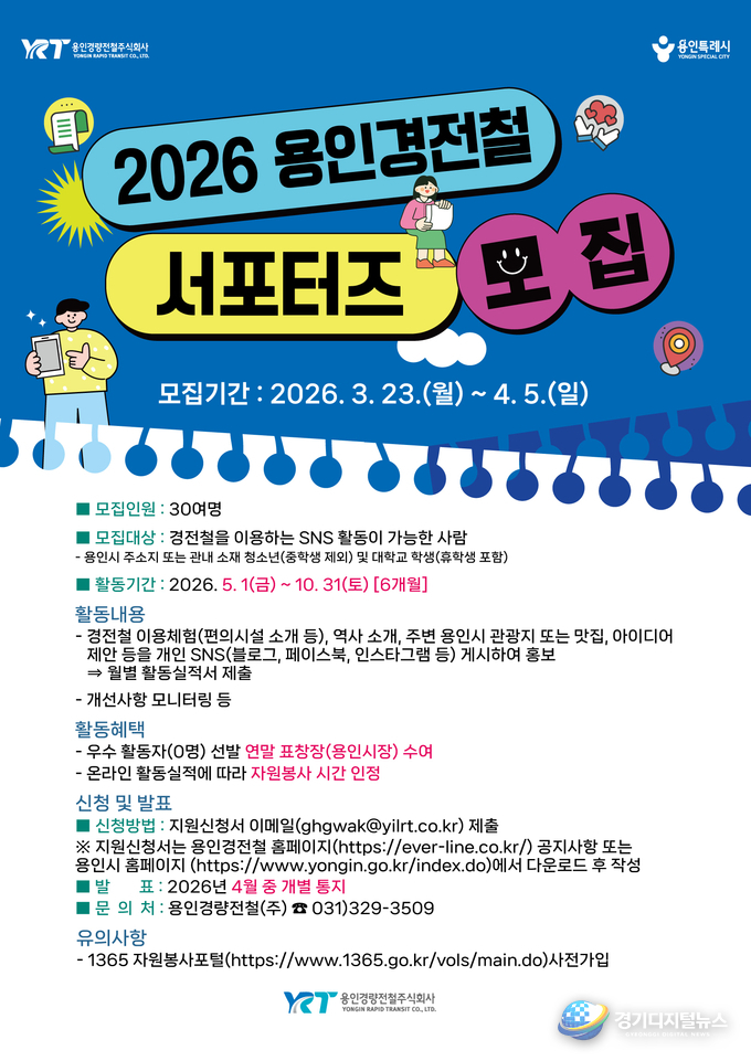 용인특례시(시장 이상일)는 4월 5일까지 용인의 대표적인 철도인 용인경전철을 활성화하고자 ‘용인경전철 서포터즈’를 모집한다고 23일 밝혔다.