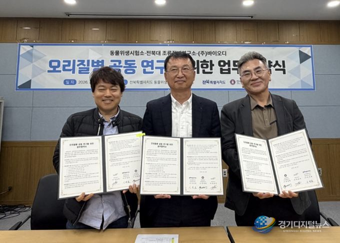 경기디지털뉴스 마성숙 기자 | 전북특별자치도는 24일 전북대학교 조류질병연구소, ㈜바이오디와 함께 오리 질병 공동연구를 위한 업무협약을 체결했다.