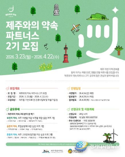 경기디지털뉴스 마성숙 기자 | 제주특별자치도와 제주관관공사(사장 고승철)는 오는 4월 22일까지 온라인 채널을 통해 지속 가능한 제주관광을 위한 실천프로젝트 지원사업인 ‘제주와의 약속 파트너스 2기’ 공모를 추진하고 있다고 24일 밝혔다.