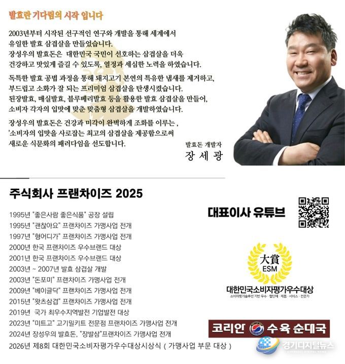 (주)프랜차이즈2025는 30여 년간 외식·식품 산업을 선도해 온 기업으로, 지속적인 연구개발을 통해 다양한 브랜드를 선보여 왔다. 특히 ‘장성우의 발효돈’은 독자적인 발효 공법으로 완성된 세계 최초의 발효 삼겹살로, 차별화된 기술력과 상품성을 인정받은 바 있다.