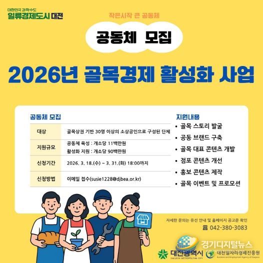 경기디지털뉴스 마성숙 기자 | 대전시는 경기침체와 소비 위축으로 어려움을 겪는 골목상권의 경쟁력 강화를 위해 ‘2026년 골목경제 활성화 사업’을 본격 추진하고, 골목상권 공동체와 골목형 상점가 참여 대상을 모집한다.