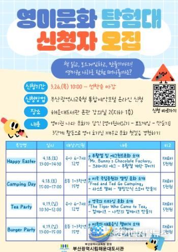 경기디지털뉴스 마성숙 기자 | 부산광역시립해운대도서관은 오는 4월 18일과 19일 해운대도서관에서 6~7세 유아와 1~3학년 초등학생 50여 명을 대상으로 영미문화 체험 특강 ‘영미문화 탐험대’를 운영한다.