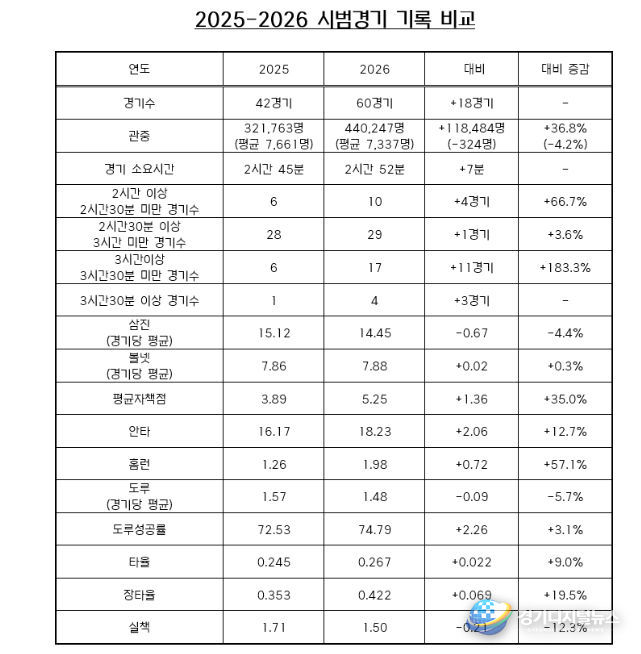 경기디지털뉴스 마성숙 기자 | 3월 24일(화) 막을 내린 2026 KBO 시범경기는 60경기에 총 44만 247명의 관중이 입장해 역대 시범경기 단일시즌 최다 관중 기록을 경신했다. 종전 기록은 2025년에 기록한 32만 1,763명이었다.