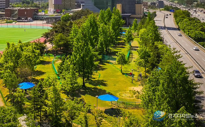 시는 하갈2교 하부 공간 정비를 통해 확보한 이곳 여유 공간에 공공기여를 통해 이 파크골프장을 조성하고 있는데, 향후 공간이 확장되면 18홀로 늘릴 방침이다.