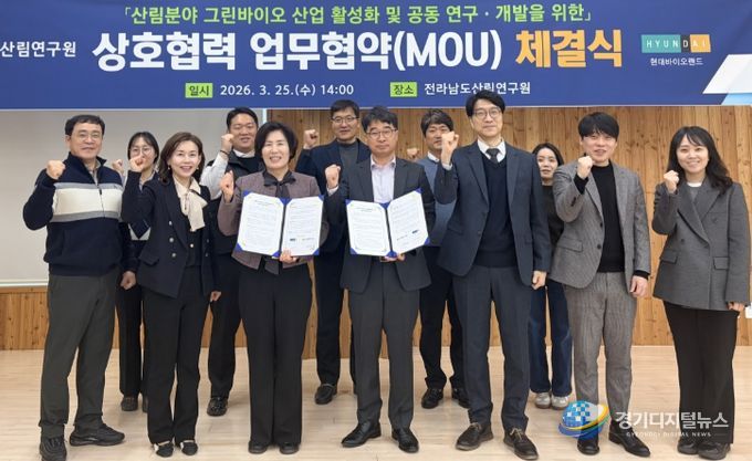 경기디지털뉴스 마성숙 기자 | 전라남도산림연구원이 25일 ㈜현대바이오랜드와 산림자원을 활용한 그린바이오 산업 활성화를 위해 업무협약을 하고, 고부가가치 제품 개발과 원물의 안정적 생산체계 구축을 위한 상호 협력에 나섰다.