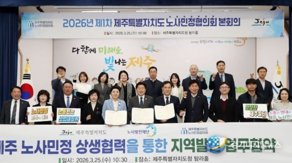 제주특별자치도는 25일 도청 탐라홀에서 2026년 제1차 제주노사민정협의회 본회의를 열어 ‘산업대전환 대응과 일터 위험격차 해소를 위한 제주특별자치도 노사민정 공동선언문’을 채택하고, 노사발전재단과 상생협력 업무협약을 체결했다.