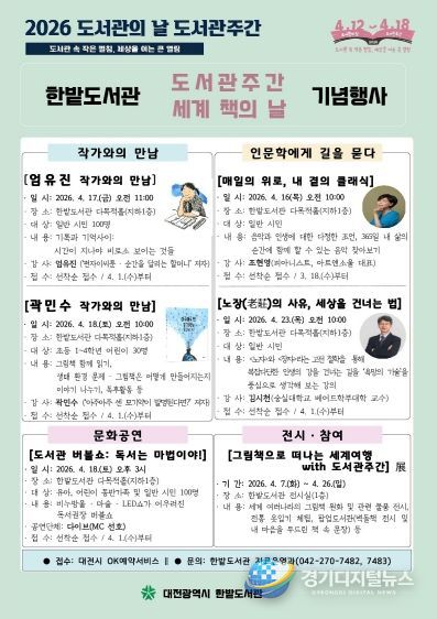 경기디지털뉴스 마성숙 기자 | 한밭도서관은 도서관 주간(4월 12일~18일)과 세계 책의 날(4월 23일)을 맞이하여 시민들의 독서 문화 확산과 문화 향유 기회 확대를 위해 다양한 프로그램을 운영한다.