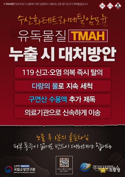경기디지털뉴스 마성숙 기자 | 소방청은 국립소방연구원이 반도체 및 디스플레이 제조 공정에서 주로 사용되는 유독화학물질인 TMAH(수산화테트라메틸암모늄)의 누출 사고 예방을 위해, 전국 취급 사업장을 대상으로‘사고 대응 요령 홍보물(리플릿)’을 제작하여 배포한다고 밝혔다.