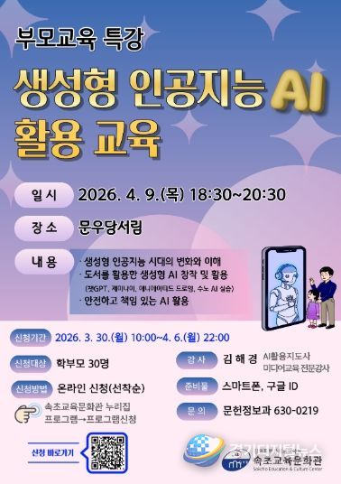 경기디지털뉴스 마성숙 기자 | 속초교육문화관은 4월 9일 오후 6시 30분, 지역 서점 문우당서림 2층에서 2026년 부모교육 특강 ‘생성형 인공지능(AI) 활용’을 운영한다.
