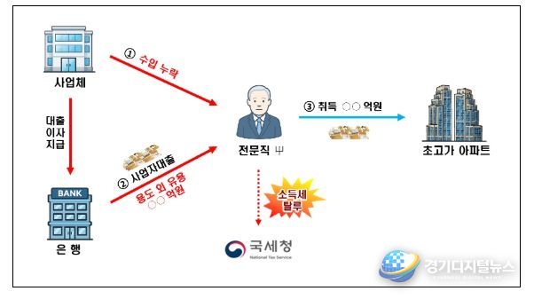 실제 고소득 전문직 사업자가 강남권 고가 아파트를 ○○여억 원에 취득하면서 ○○억 원의 사업자 대출금과 ○○억 원의 신고누락된 탈루자금을 사용한 것으로 드러났으며, 수년간 ○억 원에 달하는 사업자 대출 관련 이자를 경비 계상하여 탈세한 사실도 확인됐다.