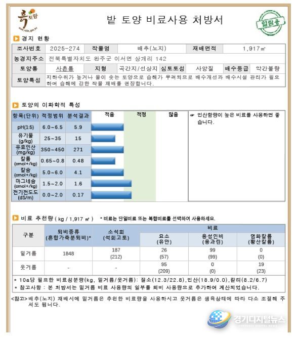 농촌진흥청은 토양환경정보시스템 ‘흙토람’에서 246작물의 비료사용처방서를 제공하고 있다. 작물을 아주심기(정식) 하기 전 토양을 채취해 가까운 농업기술센터에 분석을 의뢰하면 토양 양분 상태에 맞는 퇴비와 액비 사용량을 알려준다. 또한, 농가가 안심하고 퇴비, 액비를 사용할 수 있도록 농업기술센터에서 자가 퇴비의 부숙도와 액비 성분을 분석해 알려주고 있다.