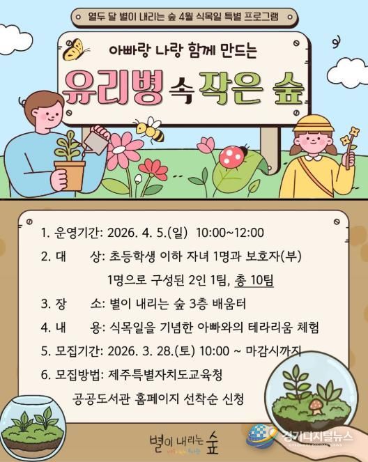 경기디지털뉴스 마성숙 기자 | 제주도교육청 제주도서관은 4월 5일 식목일을 맞아 어린이와 보호자가 함께 참여하는 특별 프로그램 ‘아빠랑 나랑 만드는 유리병 속 작은 숲’을 운영한다.