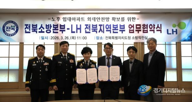 경기디지털뉴스 마성숙 기자 | 전북특별자치도소방본부(본부장 이오숙)는 26일 도청 17층 소방작전실에서 LH 전북지역본부와 노후 임대아파트 화재안전망 확보를 위한 업무협약을 체결했다고 밝혔다.