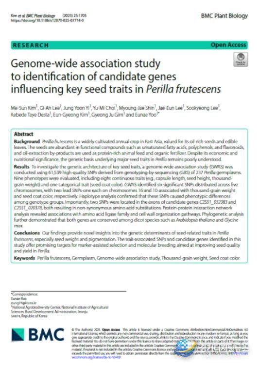 이번 연구 결과는 국제학술지 ‘BMC Plant Biology’(IF 4.8)에 논문으로 게재됐다. 앞으로 고품질 들깨 품종과 기능성 자원 개발, 분자표지 개발 등에 활용될 것으로 기대된다.