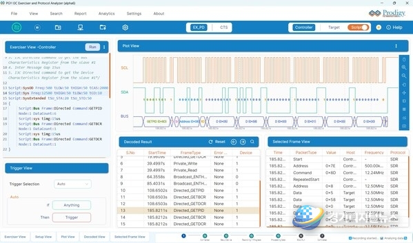 PGY-I3C-EX-PD는 프로토콜 실행, 트래픽 생성, 프로토콜 디코딩 및 오류 분석 기능을 제공하는 플랫폼으로, 엔지니어가 개발 과정에서 실제 환경 시나리오를 테스트할 수 있도록 지원한다. 또한 I3C 컨트롤러, 타깃 또는 보조 컨트롤러로 작동할 수 있기 때문에 다양한 아키텍처에서 검증이 가능하다.
