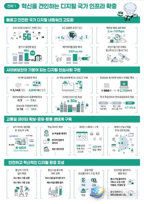 (①디지털 기반 시설'인프라' 확충) 전국 5세대 이동통신망을 단독 모드(SA)로 전환하는 등 5세대 이동통신을 고도화하고, 차세대 6세대 이동통신 상용화 기술을 개발하여 2030년 6세대 이동통신 상용화를 추진하는 등 국가 디지털 연결망(네트워크)을 고도화해 나갈 계획이다. 또한, 정보 보호 관리체계를 강화하고 공공‧민간 사이버보안 역량 강화를 위한 제도개선을 추진하는 등 사이버 위협으로부터 안전한 디지털 안심 사회를 구현하는 한편, 국가 데이터 통합 온라인 체제 기반(플랫폼)을 구축하는 등 고품질 데이터 생태계를 조성한다.