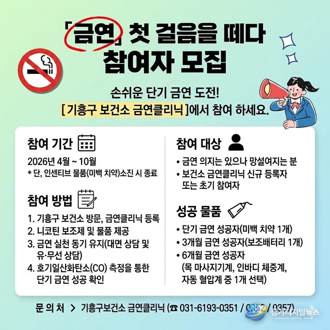 용인특례시 기흥구보건소가 오는 4월부터 10월까지 금연을 희망하는 시민들을 위해 ‘단기 금연 프로그램’을 시범 운영한다.