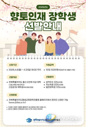 경기디지털뉴스 마성숙 기자 | 전북특별자치도평생교육장학진흥원이 도내 출신 대학생들의 안정적인 학업 전념을 지원하기 위해 ‘2026년도 전북특별자치도 향토인재 장학생’ 선발에 나선다.