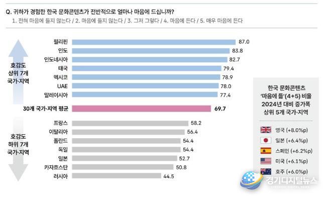 이번 조사 결과, 응답자의 10명 중 7명(69.7%)이 한국 문화콘텐츠에 대해 호감을 나타냈으며, 한류가 한국 제품 및 서비스 구매에도 긍정적인 영향을 미치는 것으로 확인돼 ‘케이-컬처’의 지속적인 인기와 파급력을 입증했다. 특히, 필리핀(87.0%), 인도(83.8%), 인니(82.7%), 태국(79.4%) 등 동남아시아 지역의 선호가 높게 나타났으며, 그간 호감도가 비교적 낮았던 미주·유럽 국가들의 선호도 작년 대비 증가하는 양상을 보였다.