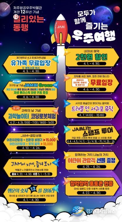 경기디지털뉴스 마성숙 기자 | 제주국제자유도시개발센터)에서 운영하는 제주항공우주박물관은 개관 12주년을 기념하여 4월 1일부터 4월 30일까지 한달간‘일리(12) 있는 동행, 모두가 함께 즐기는 우주여행’을 주제로 특별 프로모션을 실시한다고 밝혔다.