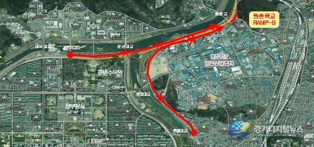 이로 인해 공사구간은 원촌육교 램프-B(원촌교네거리에서 신탄진방향 진입부) 측면 보강토옹벽이다.