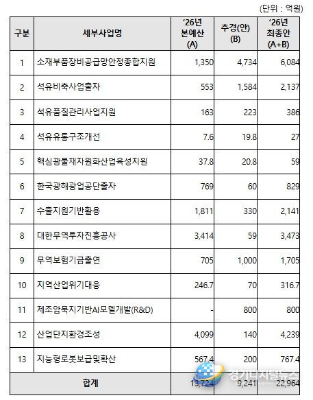 산업통상부는 중동전쟁 위기 극복을 위해 금번 추가경정예산안에 ▲석유·핵심 전략자원의 공급망 안정화, ▲수출기업 비용 경감 및 석유화학 등 피해산업 지원, ▲제조 AX 대전환 등 3대 분야, 총 9,241억원을 편성했다.