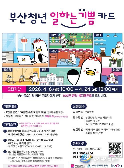 경기디지털뉴스 마성숙 기자 | 부산시는 오는 4월 6일부터 4월 24일까지 '2026년 부산 청년 일하는 기쁨카드 지원 사업'에 참여할 청년을 모집한다고 밝혔다.