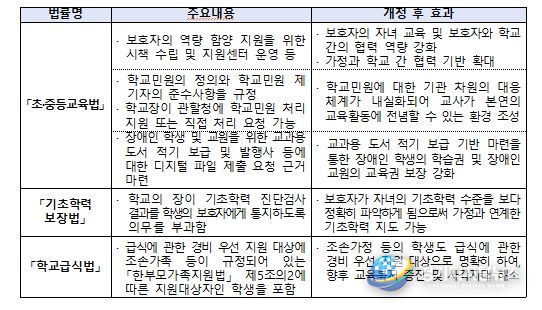 이번 개정안에서는 장애인용 교과서 적기 제작 및 보급, 보호자 역량 강화 지원, 기초학력 진단검사 결과 보호자 통지 등 다양한 분야의 입법이 이뤄졌다.