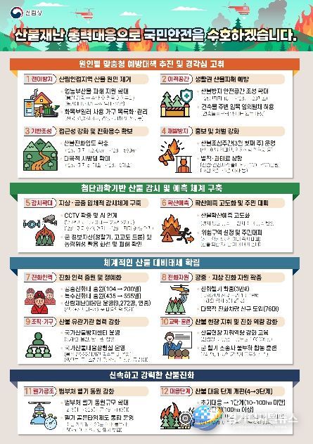 개선된 정책의 핵심은 산불 대응에 있어 국가의 모든 역량을 총동원하는 것으로, 산불 발생 시 산림청뿐만 아니라 행안부·국방부·소방청·경찰청·기상청 등 관계부처와 지방정부가 보유하고 있는 인력·자원을 총동원하여 산불에 대응하고 있다.