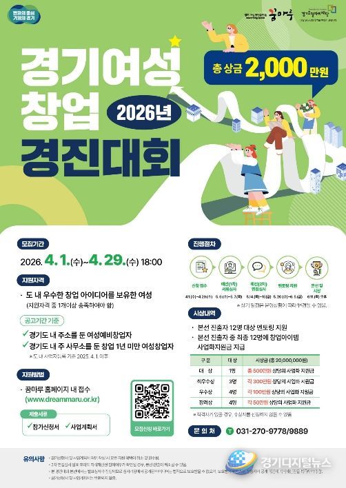 경기디지털뉴스 마성숙 기자 | 경기도가 ‘2026년 경기 여성창업 경진대회’를 추진하며 오는 29일까지 참가자를 모집한다.