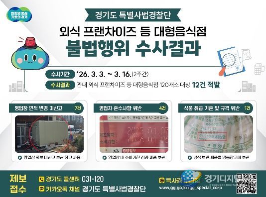 경기디지털뉴스 마성숙 기자 | 경기도 특별사법경찰단은 지난 3월 3일부터 16일까지 도내 외식 프랜차이즈 등 대형음식점 120개소를 대상으로 집중 수사를 실시한 결과 영업장 면적 변경 미신고 및 영업자 준수사항 위반 등 총 12건의 불법행위를 적발했다.