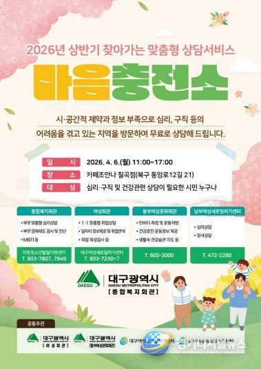 경기디지털뉴스 마성숙 기자 | 대구광역시 종합복지회관은 4월 3일 북구 동천동 소재 카페조안나 칠곡점에서 2026년 상반기 찾아가는 현장상담 프로그램 ‘마음충전소’를 운영한다.