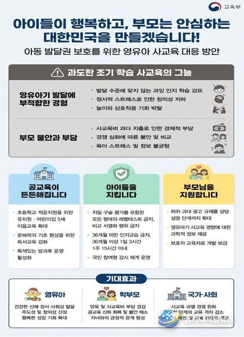 경기디지털뉴스 마성숙 기자 | 교육부)는 4월 1일‘아동 발달권 보호를 위한 영유아 사교육 대응 방안’을 발표한다. 이는 ‘4세·7세 고시’ 현상 등 비정상적으로 확장된 영유아 사교육 시장을 바로잡고, 과도한 조기 경쟁과 선행 학습으로 인한 발달 저해, 정서적 부담 가중 등 아동학대적 양상까지 나타나는 상황에 대응하기 위해서이다.