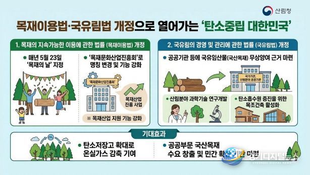 이번 법률 개정은 목재산업·문화 확산을 위한 정책을 강화하고, 국산 목재 수요 창출 효과를 이끌어 탄소저장고를 확대하고 국가 온실가스 감축목표에 기여할 것으로 기대된다.