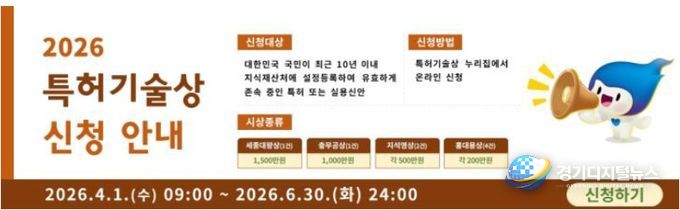 경기디지털뉴스 마성숙 기자 | 지식재산처는 4월 1일부터 6월30일까지 「2026년 특허기술상」 신청 접수에 들어간다고 밝혔다. 「특허기술상」은 발명자의 의욕 고취 및 국민적 발명 분위기 확산을 위해 우수 기술을 발굴·선정하여 발명자에게 시상하는 제도이다.