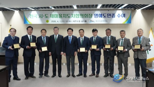 제주도는 1일 오전 도청 삼다홀에서 전국 시도 새마을지도자협의회장 명예도민증 수여식을 열었다. 행사에는 양윤호 새마을지도자중앙협의회장을 비롯해 전국 각 시도를 대표하는 협의회장 등 20명이 참석했다.
