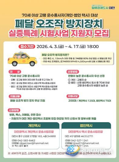 경기디지털뉴스 마성숙 기자 | 대전시는 고령 운전자의 급발진 교통사고를 예방하기 위해 ‘페달오조작 방지장치 실증특례 시범사업’을 추진하고, 고령의 택시 운전자를 대상으로 지원자를 모집한다.