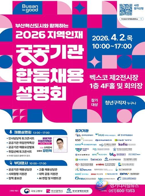경기디지털뉴스 마성숙 기자 | 부산시는 오늘(2일) 오후 2시 벡스코 제2전시장에서 부산 혁신도시와 함께하는 '2026 지역인재 공공기관 합동채용설명회'를 개최한다고 밝혔다.
