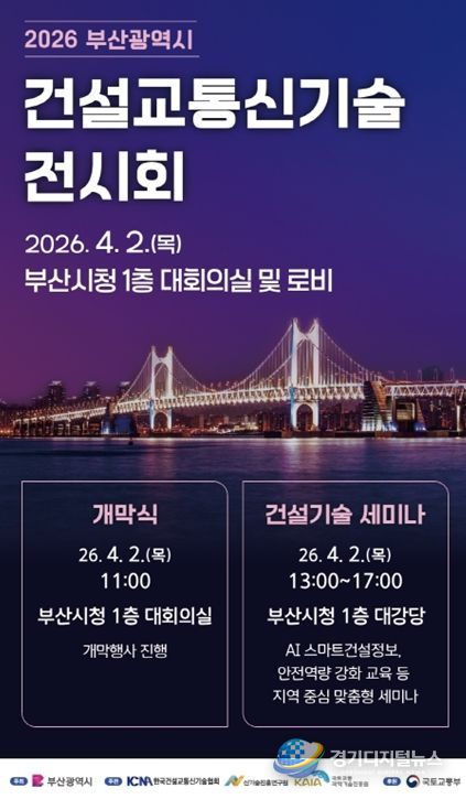 경기디지털뉴스 마성숙 기자 | 부산시는 우수 건설 신기술 홍보와 활용을 촉진하고 지역 중소기업의 성장동력을 지원하기 위해 오늘(2일) 오전 10시부터 오후 5시까지 시청 1층 대회의실과 로비에서 '2026년 부산광역시 건설교통신기술 전시회'를 개최한다고 밝혔다.