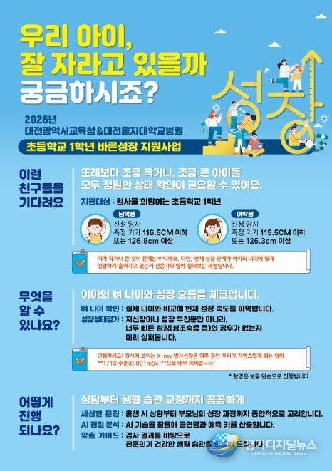 이번 사업은 대전을지대학교병원이 참여하며, X-ray 촬영으로 골연령과 성장 속도 등 현재의 발달 상태를 확인한다. 또한 검사 결과를 바탕으로 의료진과의 상담을 통해 가정 등 실생활에서 활용할 수 있는 교육 자료를 제공하는 등 체계적인 성장 관리를 지원한다.