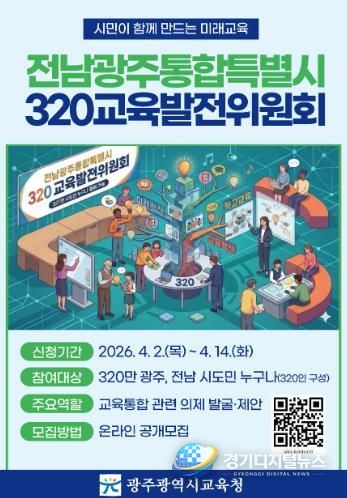 경기디지털뉴스 마성숙 기자 | 광주시교육청은 광주・전남 교육행정 통합 시대를 대비하고 통합 이후 지역 교육의 미래 청사진을 그리기 위한 ‘전남광주통합특별시 320교육발전위원회’에 참여할 시도민 위원 320명을 공개 모집한다.