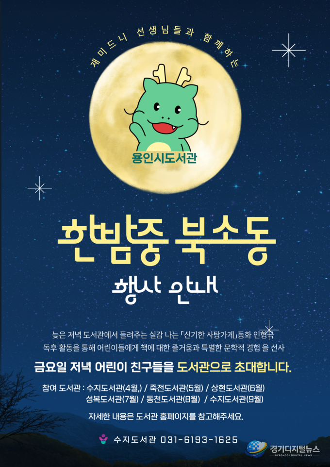 용인특례시(시장 이상일) 서부도서관은 수지·죽전·상현·성복·동천도서관에서 야간 독서문화 프로그램 ‘한밤중 북소동’을 운영한다고 25일 밝혔다.