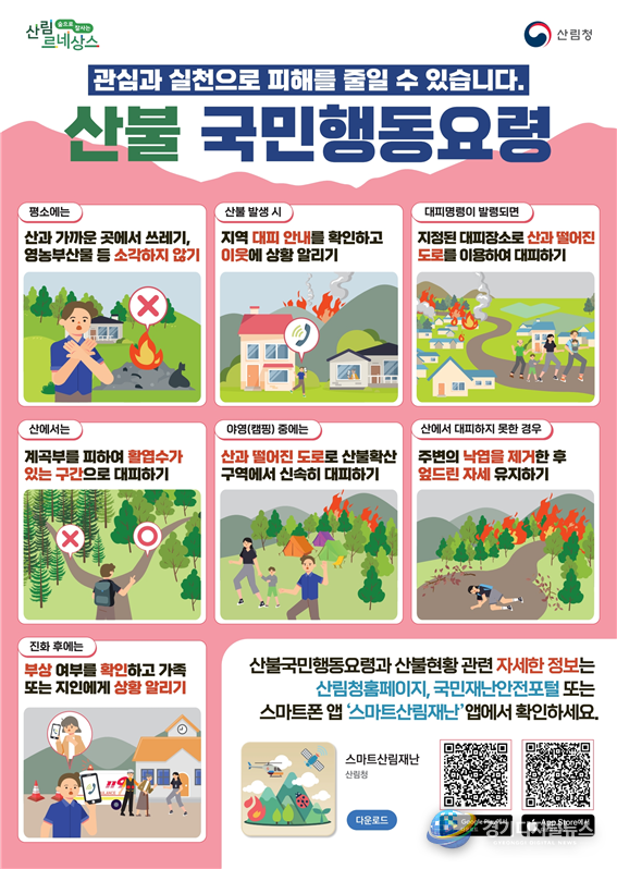 교육과 홍보 내용은 ▲산불 주요 발생 원인 ▲산림과 산림인접지 내 금지행위 ▲지역내 산불 사례 전파 ▲산림재난방지법에 따른 과태료 규정 등이다. 구는 각 읍·면·동에 산불예방 국민행동요령 홍보물과 산불예방 영상자료 등 다양한 홍보 자료를 배부해 예방 효과를 높일 방침이다.