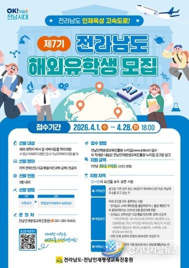 경기디지털뉴스 마성숙 기자 | 전라남도와 전남인재평생교육진흥원은 글로벌 핵심 인재 육성을 위해 세계 명문대 유학 기회를 제공하는 ‘제7기 전라남도 해외유학생’을 오는 28일까지 모집한다고 밝혔다.