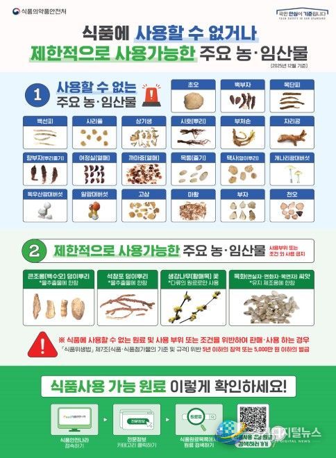 식약처는 안전성이 확인되지 않은 농·임산물 섭취로 인한 피해를 예방하기 위해 식품안전나라 누리집에서 섭취 가능한 농·임산물 종류와 식용 부위를 확인할 것을 권고했다.