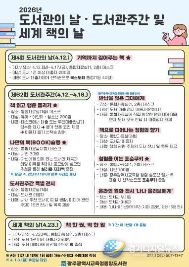 경기디지털뉴스 마성숙 기자 | 광주광역시교육청중앙도서관은 4월 12일부터 23일까지 본관과 분관 최상준도서관에서 ‘도서관 속 작은 펼침, 세상을 여는 큰 열림’을 주제로 독서축제를 진행한다.