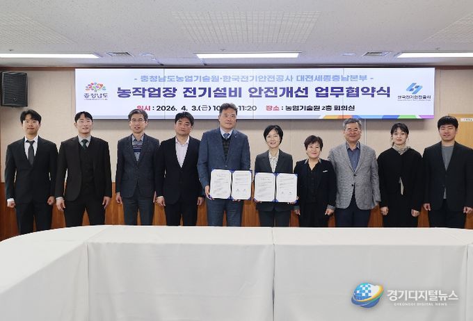 경기디지털뉴스 마성숙 기자 | 충남도 농업기술원은 3일 기술원 회의실에서 한국전기안전공사 대전세종충남본부와 ‘농업현장 전기설비 안전진단 및 기술지원’을 위한 업무협약(MOU)을 체결했다.