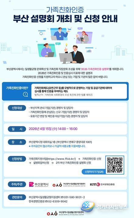 경기디지털뉴스 마성숙 기자 | 부산시는 지역기업의 일가정 양립 문화를 확산하고 가족친화 경영 환경 조성을 위한 '2026년 가족친화인증 사업'을 본격적으로 추진한다고 밝혔다.